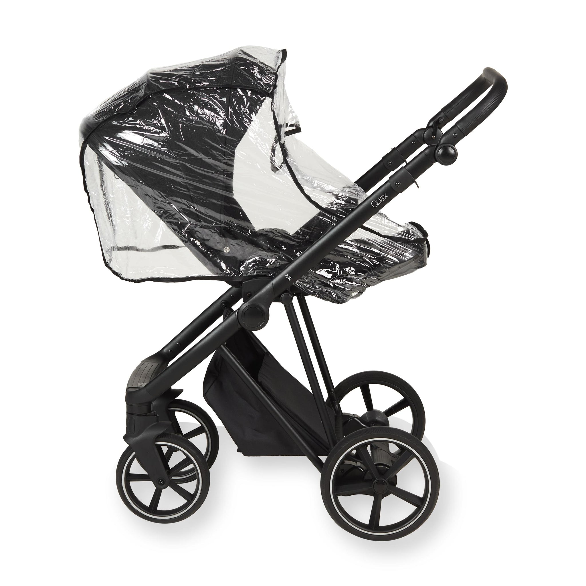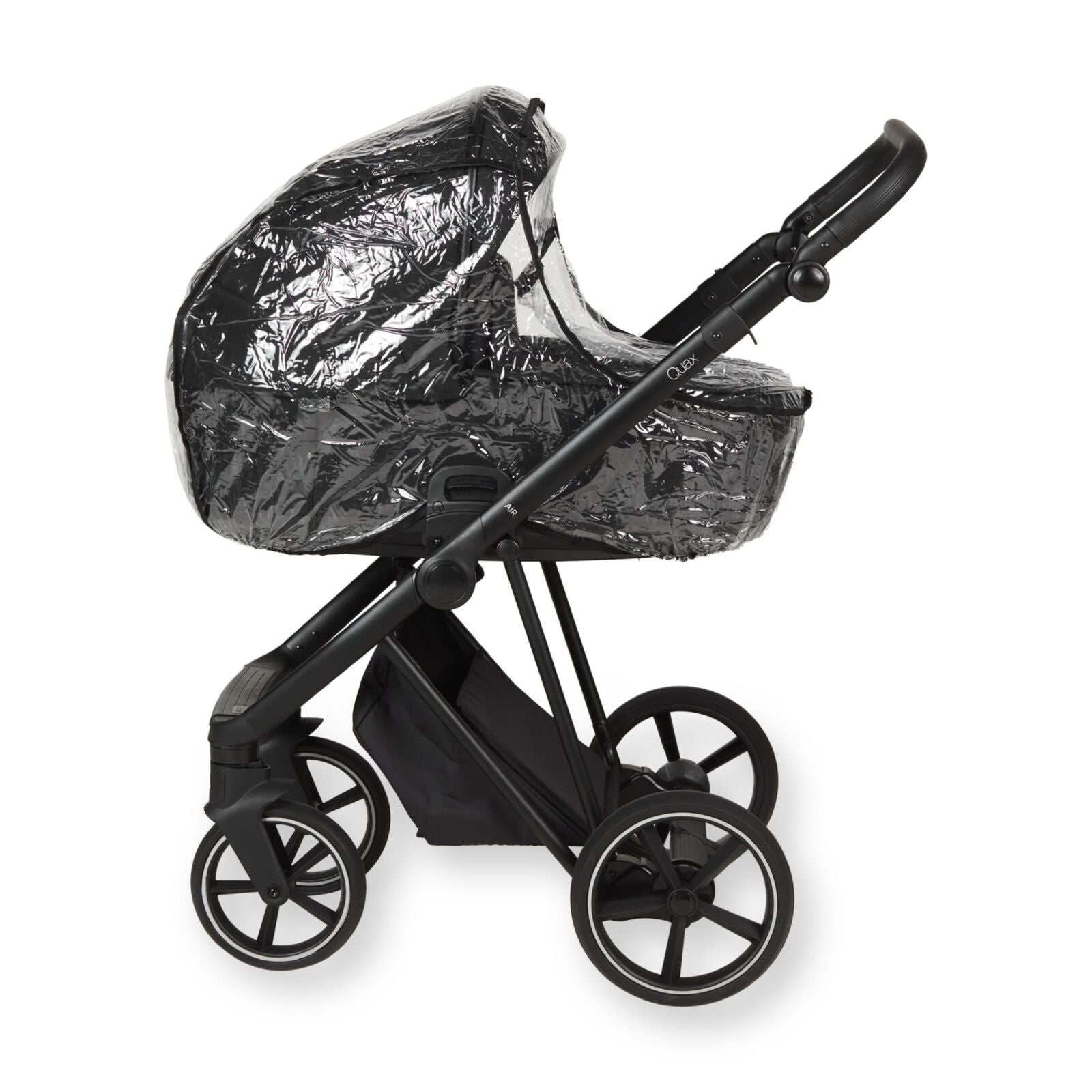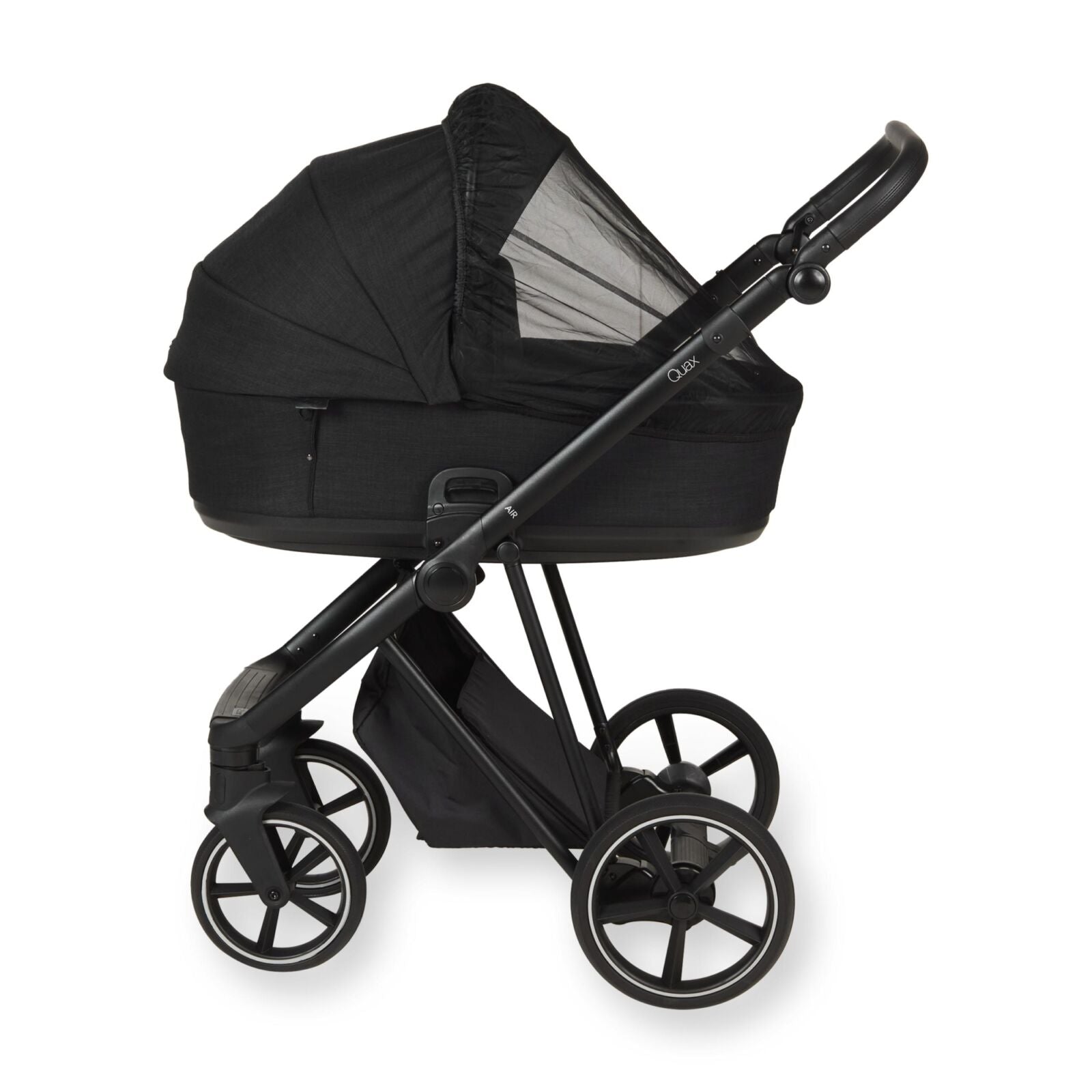 Með Quax Air vagninum fylgja einnig nauðsynleg fylgihlutir: regnhlíf, moskítónet og samlita bleiupoki. Neðst á vagninum er rúmgott geymsluhólf sem er hægt að fella saman þegar það er ekki í notkun – þannig heldurðu öllu snyrtilegu og aðgengilegu.