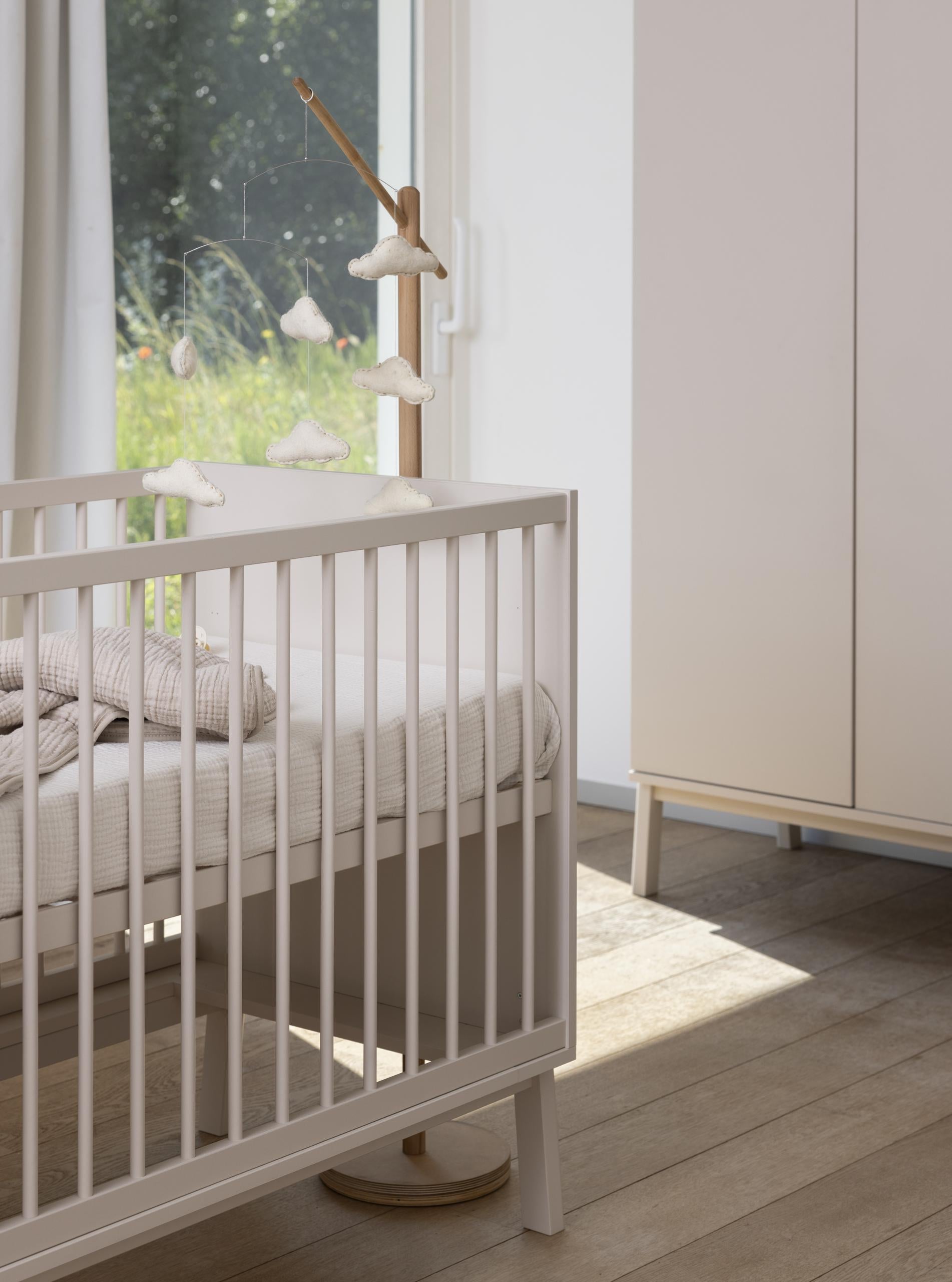 Rúmið er 124 cm langt, 65 cm breitt og 92 cm hátt, með stillanlegri botnplötu í þremur hæðum (30, 45 og 60 cm) sem aðlagast vexti barnsins. Það uppfyllir evrópskan öryggisstaðal EN 716:2017+AC:2019, sem tryggir vernd gegn fingra- og höfuðklemmum og veitir hámarks loftræstingu.