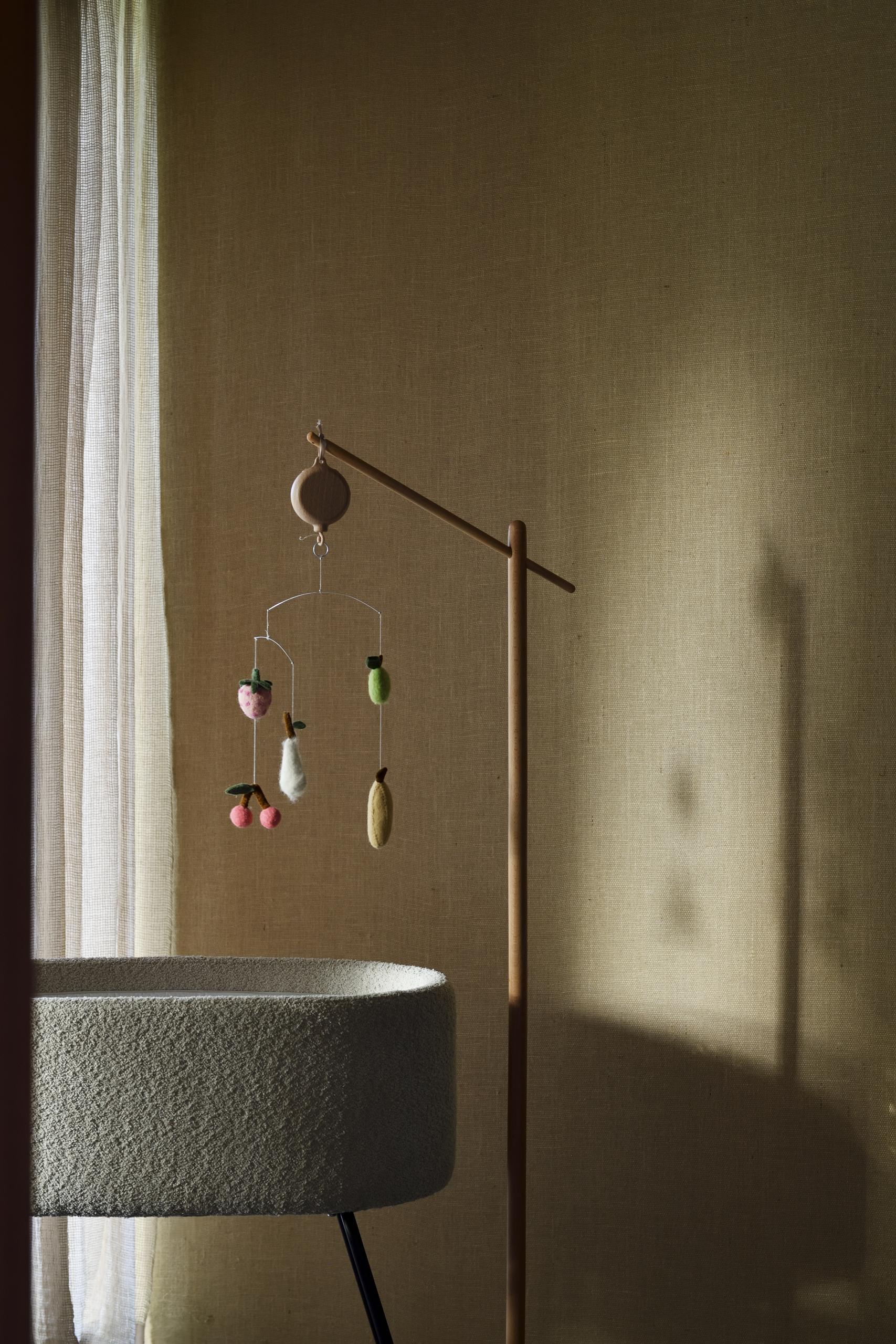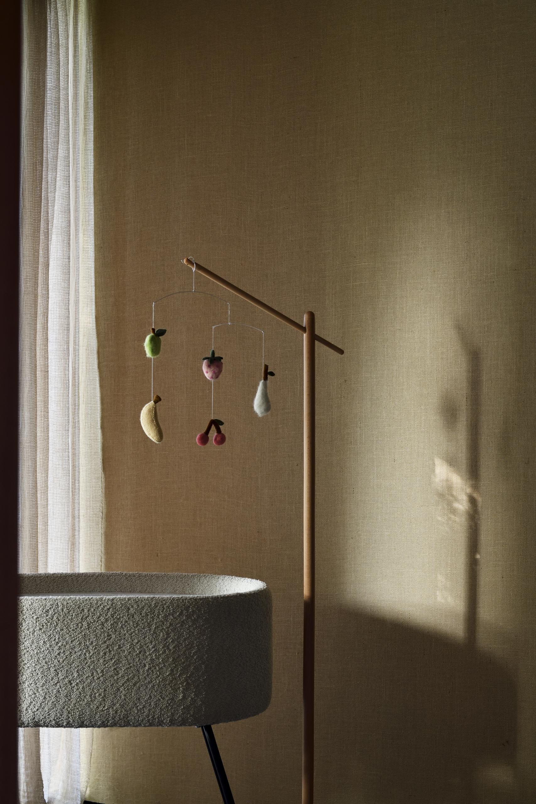 Óróinn festist auðveldlega á Viðar standur - Wooden Stand- Mobile (selt sér) og myndar mjúka, svífandi hreyfingu yfir rúmi, leikgrind eða matarstól. Þetta skapar róandi og sjónrænt örvandi andrúmsloft fyrir barnið.